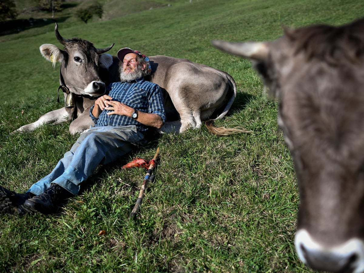 نقلت بقرة سويسرية بالطائرة من إحدى مزارع الأبقار في جبال الألب.