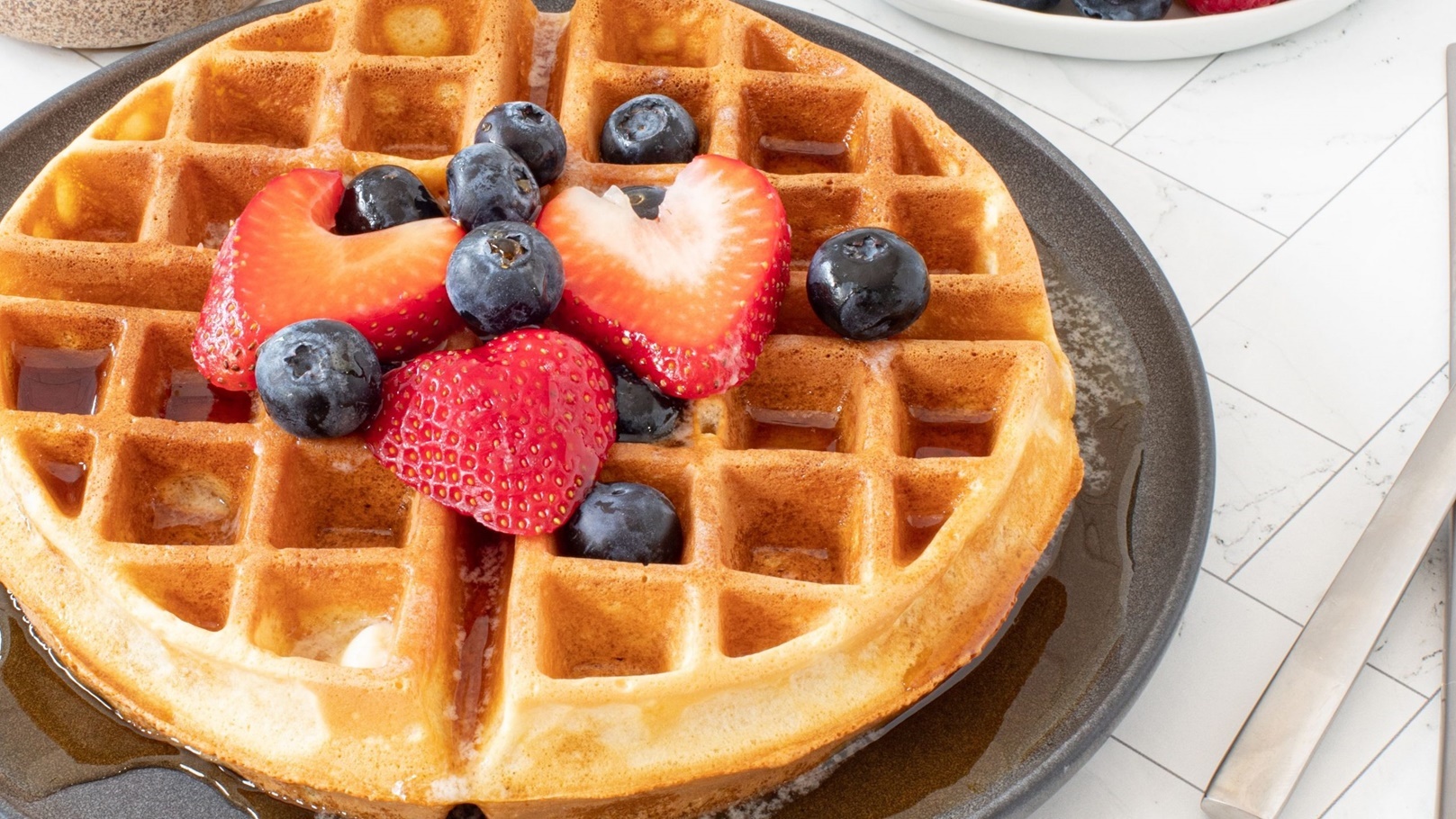 3- نحضر مقلاة الوافل ونضعها على نار متوسطة، ونقوم بملئ ربع الكوب من الخليط السابق، ونتركه لمدة دقيقتين حتى يكون لونه ذهبي، وبعده نقوم بقلب الوافل على الوجه الآخر باستخدام أعواد خشبية، لمدة دقيقتين.