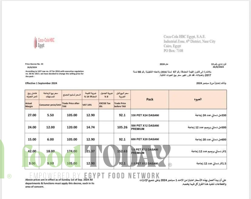 وأضاف المصدر أن كوكاكولا رفعت أسعار مياه دساني وزن العبوة 600 مل لتسجل 6 جنيهات للمستهلك، بزيادة جنيه، وفقا لمستند مرسل للتجار.