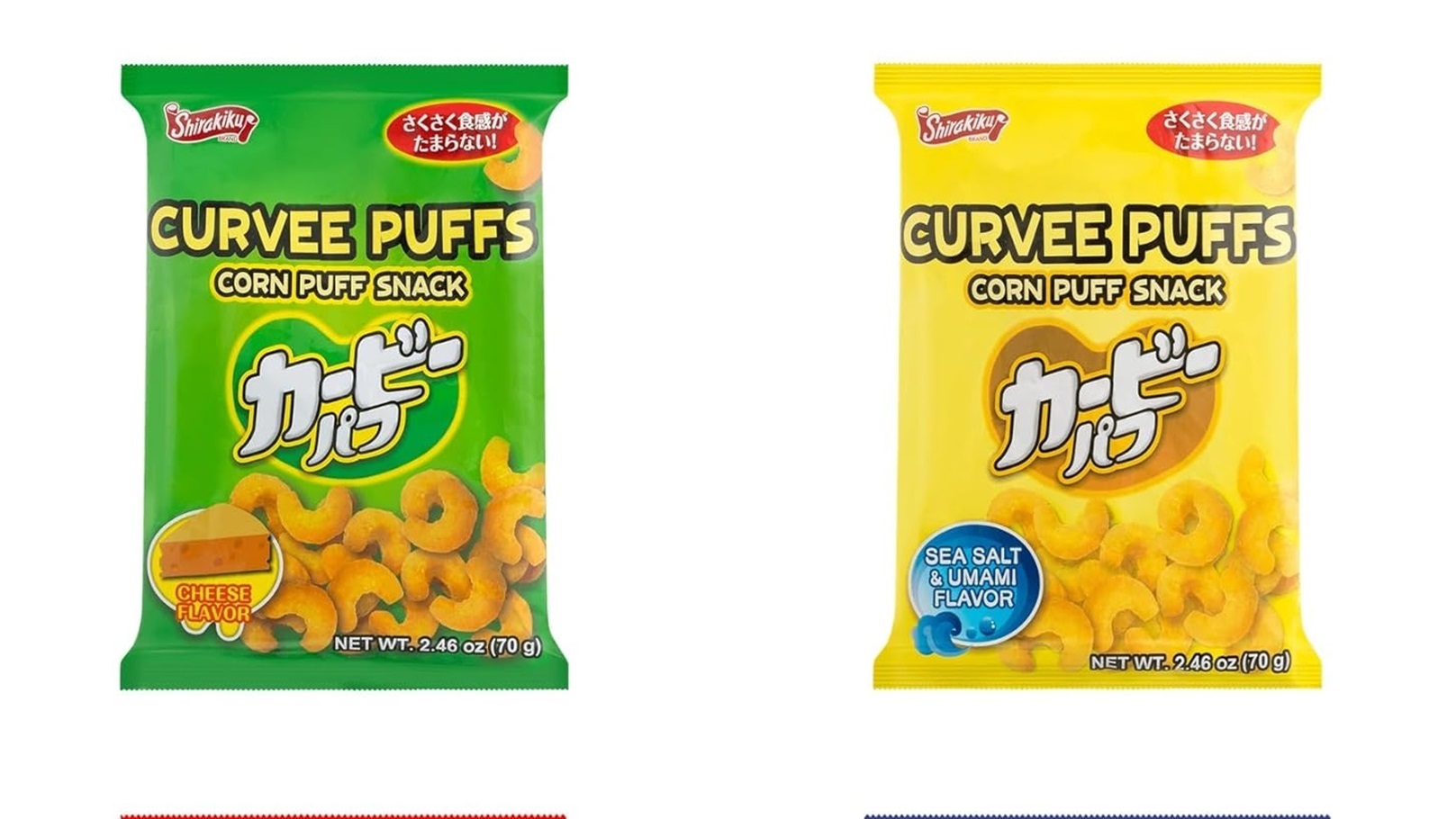 Shirakiku Curvee Puffs Corn Puff Snack: بجميع نكهاته، بما في ذلك نكهة ملح البحر والأومامي ونكهة حساء الذرة.