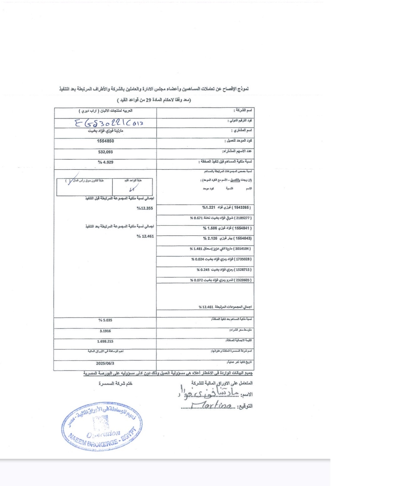 شهدت شركة العربية لمنتجات الألبان – آراب ديري تحركاً استثمارياً داخلياً لافتاً، حيث قامت مارينا فوزي فؤاد بخيت بتنفيذ عملية شراء كبيرة داخل هيكل مساهمي الشركة، ما أسفر عن رفع حصتها إلى نحو 4.93% من إجمالي أسهم الشركة.
