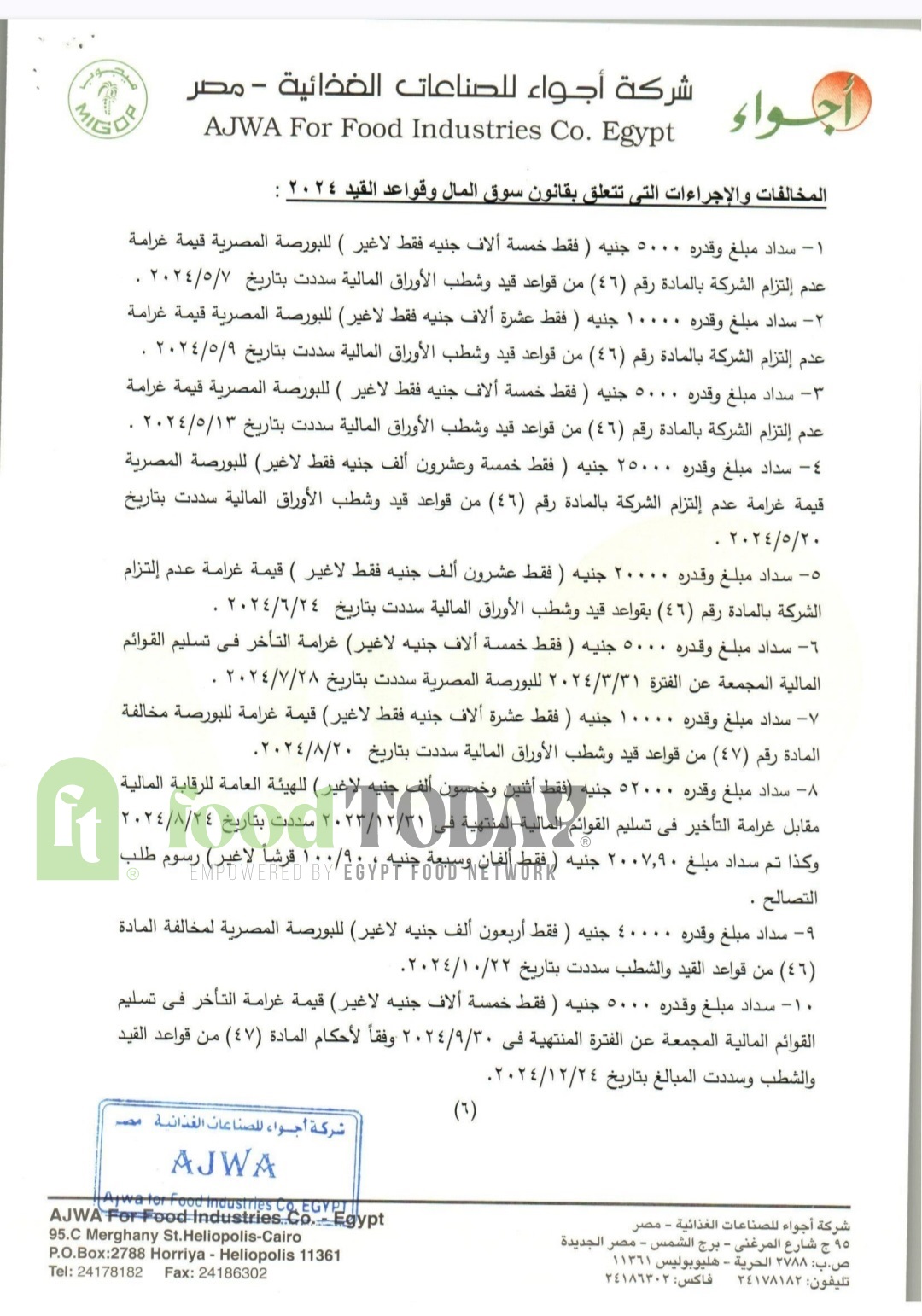 كشفت المستندات التي حصلت "food today" على نسخة منها عن سلسلة من المخالفات التنظيمية خلال عام 2024 لشركة "أجواء للصناعات الغذائية - مصر" أدت إلى فرض غرامات مالية متعددة من قبل البورصة المصرية والهيئة العامة للرقابة المالية، ما يشير إلى وجود تحديات واضحة في الالتزام بقواعد سوق المال.