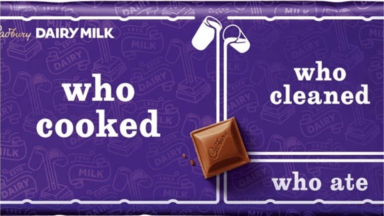 أطلقت شركة Cadbury الشهيرة مجموعة جديدة من ألواح الشوكولاتة، ولكن هذه المرة بفكرةٍ مُبتكرةٍ أثارت جدلاً واسعاً. فقد تم تقسيم العبوة إلى أقسامٍ مُتعددة، كل قسمٍ منها يحمل مهمة مُحددة يقوم بها الشخص من أجل أحبائه.
