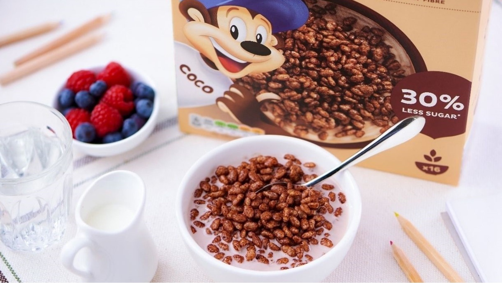 تؤكد الشركة أن منتجات Coco Pops الجديدة من Hazelnut Choc Flavour Coco Pops تحتوي على نسبة قليلة من السكر بنسبة 30%
